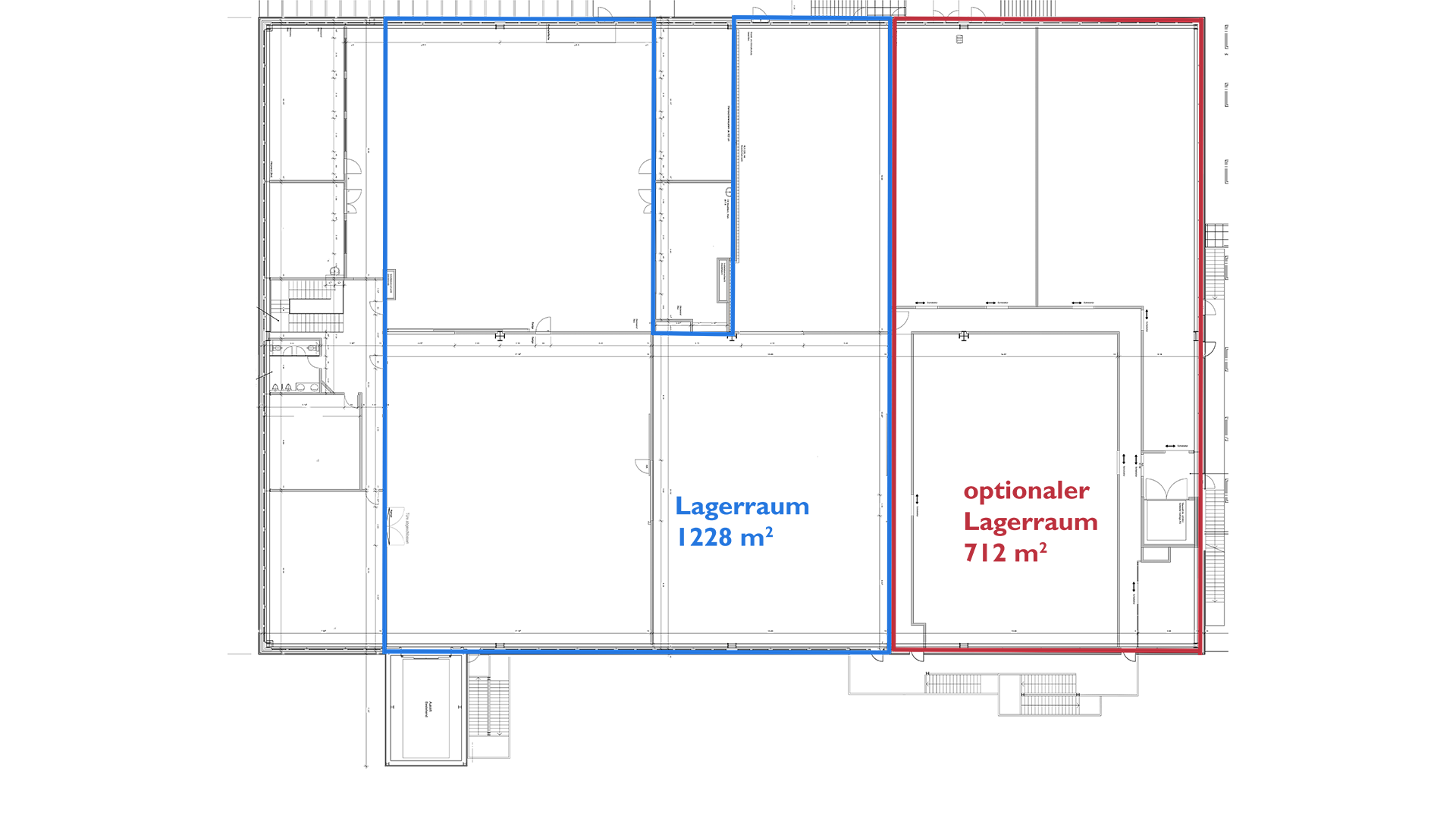 Mindestfläche 1228 m2, optional können noch weitere 712 m2 dazu gemietet werden.